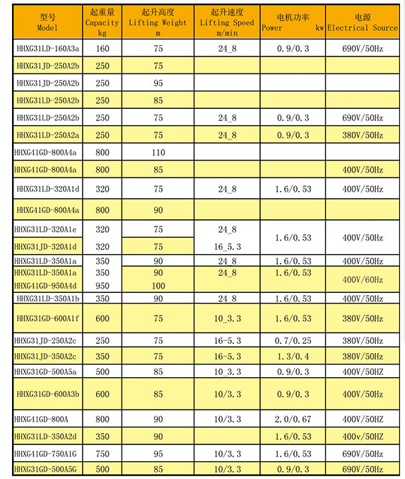 風電葫蘆參數表: